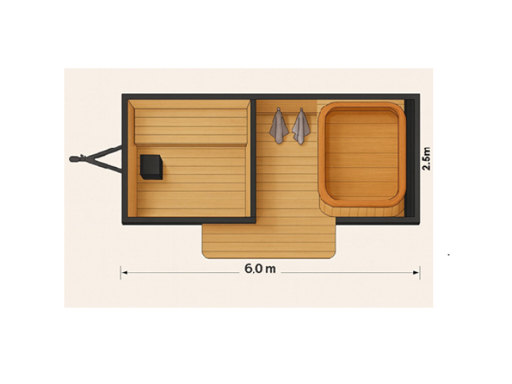 Durchdachte Raumaufteilung (6,0 x 2,5 m) – eine Sauna mit großzügiger Verglasung und ein Bereich mit Whirlpool und Ruhebereich – ausgestattet mit einem Jacuzzi für 5 Personen mit Heizung, 28 Luftdüsen, LED-Beleuchtung und pneumatischer Steuerung.